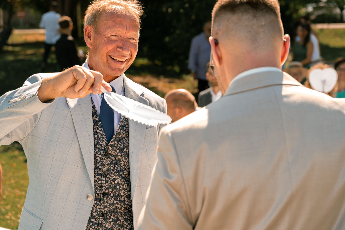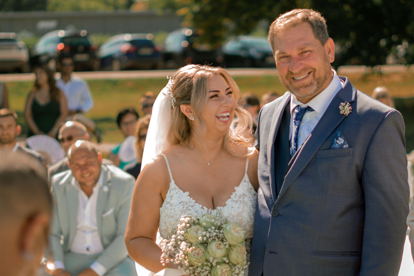 Die freie Trauung fand am Nachmittag auf den weitläufigen Wiesen des angrenzenden Golfplatzes statt – mit Blick über die grüne Landschaft und inmitten einer entspannten Sommerstimmung. Nach dem Ja-Wort wurde mit kühlem Sekt und Aperol angestoßen. Viele der Gäste waren aus Italien angereist, einige sogar direkt aus Sizilien. Mit ihrer offenen Art und Lebensfreude brachten sie sofort echtes „Bella Italia“-Feeling auf die Feier. Schon vor dem Abendessen wurde ausgelassen getanzt, gelacht und gefeiert.